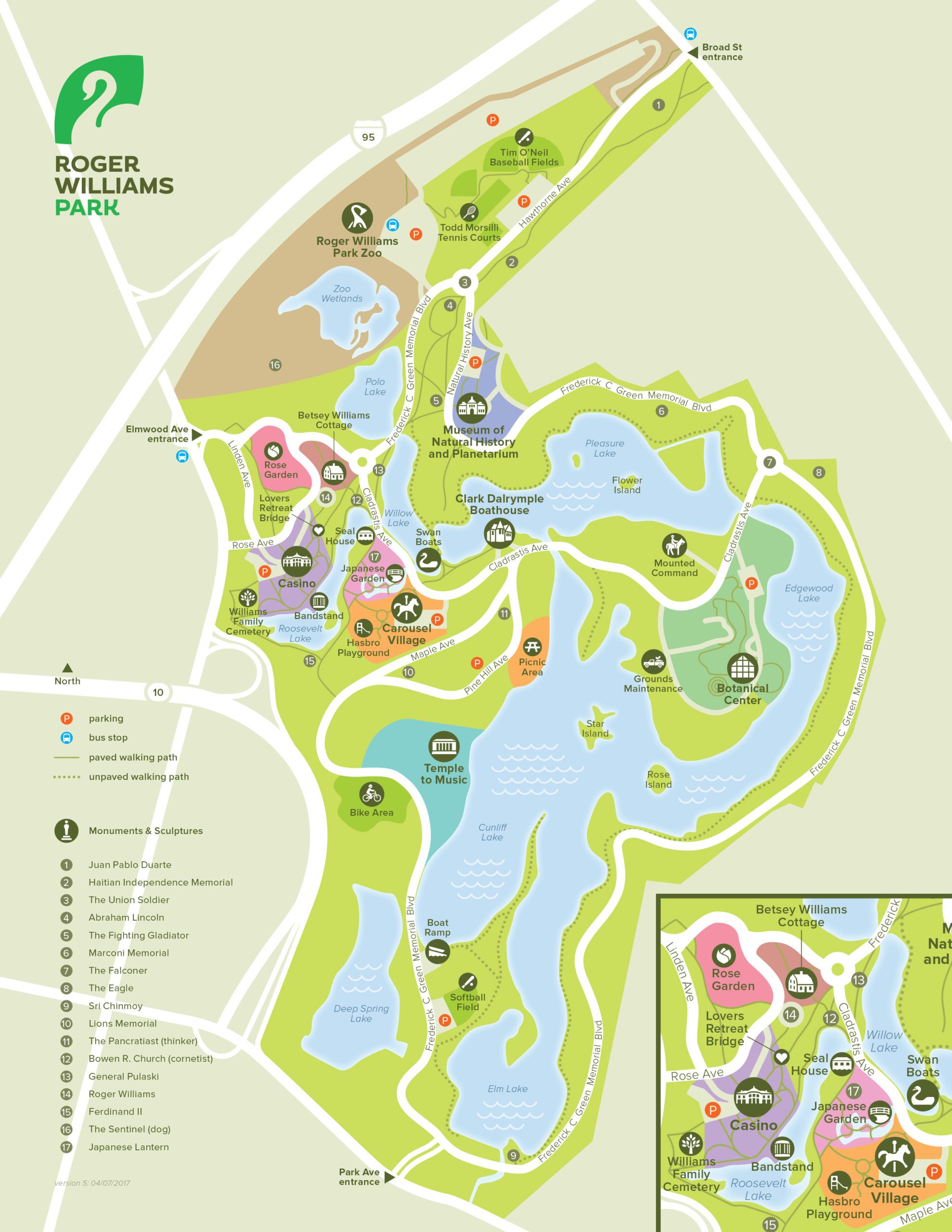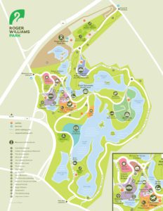 Map of Roger Williams Park showing landmarks like the Zoo, Museum of Natural History, Botanical Center, and various lakes and trails.