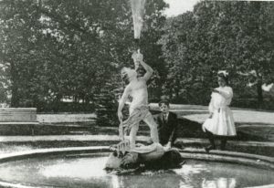 A historic image of Broad Street Fountain, circa 1900, featuring a statue of a child with a fish, surrounded by trees and two onlookers.