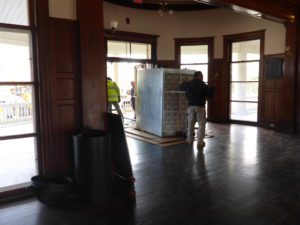 Workers move a large metal unit through a wooden-floored room with windows and dark wood paneling.