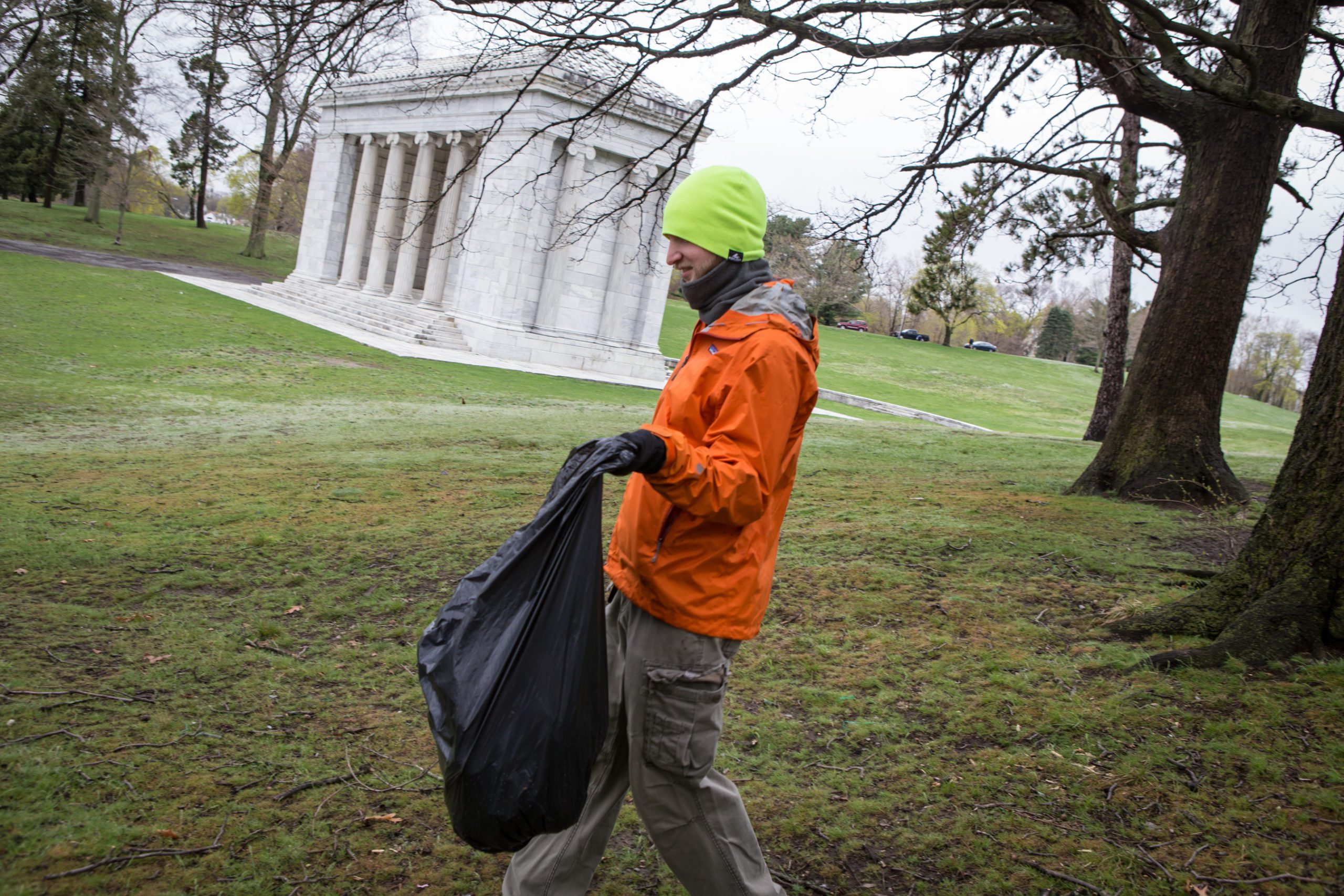 A person in an orange jacket and neon beanie cleans up litter in a park near a white columned building.