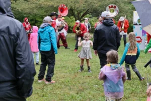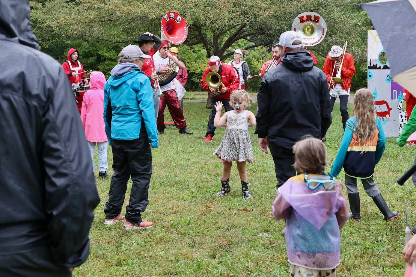 A lively band performs outdoors, surrounded by people in rain gear. A child with face paint playfully raises her hands in the center.