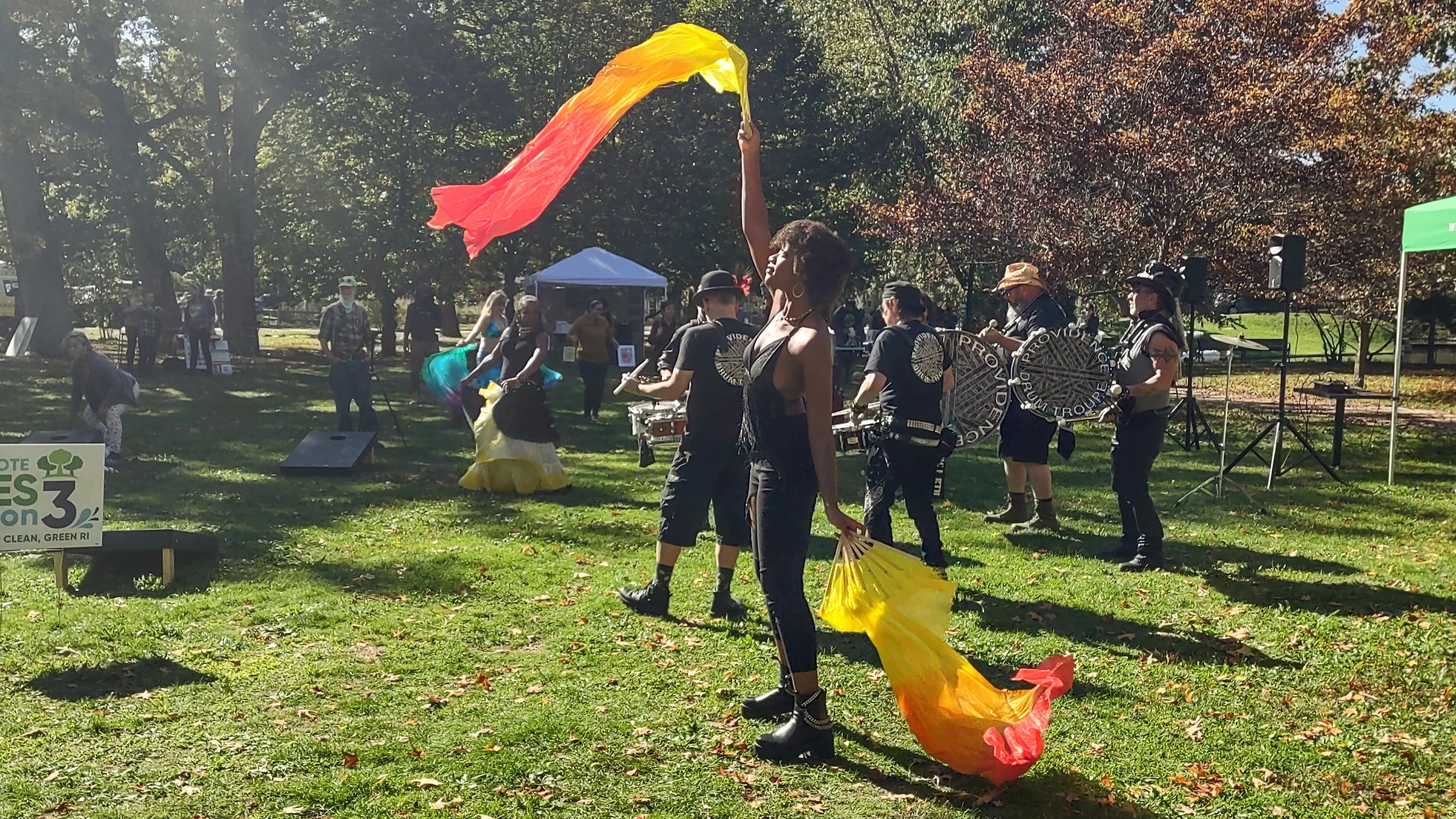 A performer waves red and yellow flags alongside the Providence Drum Troupe in a park. A "Vote Yes on 3" sign is visible.
