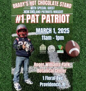 Brady's Hot Chocolate Stand event poster featuring a child in Patriots gear. Special guest: Pat Patriot. March 1, 2025, 11am-1pm, Roger Williams Park Botanical Center, Providence, RI.