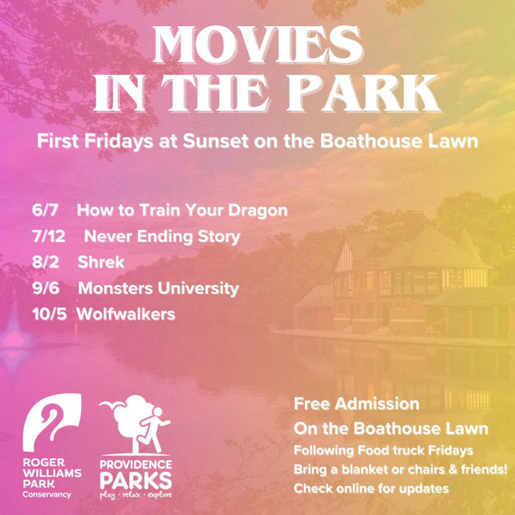 The Roger Williams Park Conservancy is excited to present First Friday Movies in Roger Williams Park.Β These free, family-friendly events take place on Friday evenings at sunset (times change based on sunset) on the Boathouse Lawn (across from the Carousel Village), grab a bite at Food Truck Friday and come across the road and picnic on the lawn; see a Park map.Β Bring a blanket and chair and pack a picnic, or arrive early to grab dinner at Food Truck Friday!