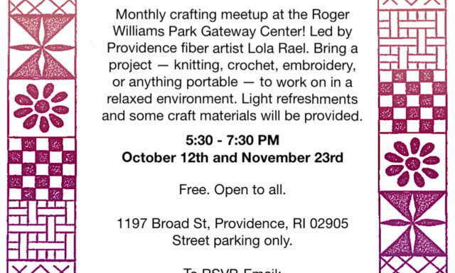 Local fiber artist Lola Rael invites you to an evening of crafting and conversation. Bring along a work in progress – handicrafts are encouraged, but anything portable is welcome. Email to RSVP: [email protected]