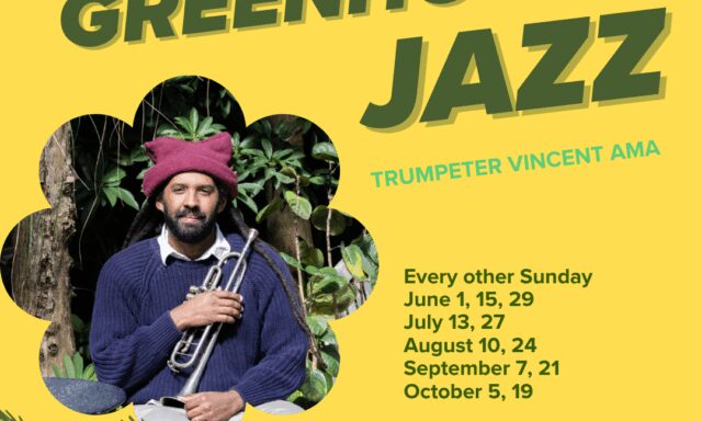 Greenhouse Jazz with trumpeter Vincent Ama happens every other Sunday. Stroll through the greenhouses listening to Vincent’s trumpet jazz or sit and listen a while. Free with Admission.Vincent Ama is a Providence-based musician, artist, and poet. Find him on Instagram (@Vincent_ama).