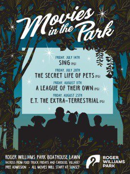 "Movies in the Park" poster at Roger Williams Park. Films: Sing, The Secret Life of Pets, A League of Their Own, E.T. Free admission.