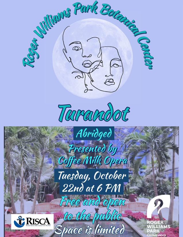 Coffee Milk Opera will present highlights from Pucciniβs beloved Turandot, in concert for Opera in the Park at the RWP Botanical Center.Β Rhode Island native Kate Norigian, soprano, will perform Princess Turandot, along with her brother, John Norigian, music director and pianist. Krista Wilhelmsen, resident of Cranston, RI will perform the role of Liu. Tenor Matthew Arnold, fellow New Englander, will perform what is considered the most famous opera aria in the world: βNessun Dorma,β known for its high notes and ability to evoke emotion, making it a popular choice for contestants on Britain/Americaβs Got Talent on other TV commercials and shows.