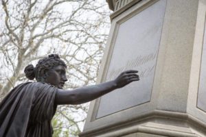 A bronze statue of a woman reaches toward an inscription reading "Roger Williams 1636" on a stone monument, with bare trees in the background.