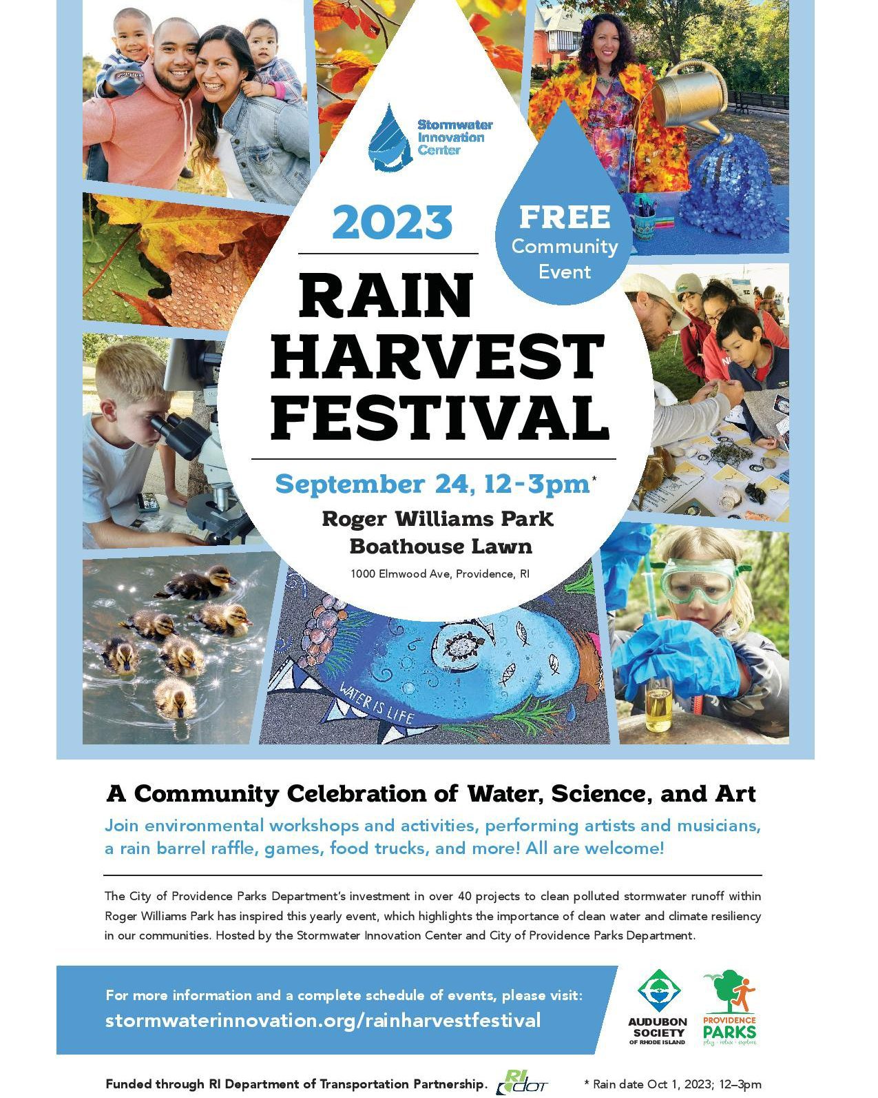 Poster for the 2023 Rain Harvest Festival at Roger Williams Park, Providence, RI, on September 24, 12-3pm. Features workshops, music, and more.