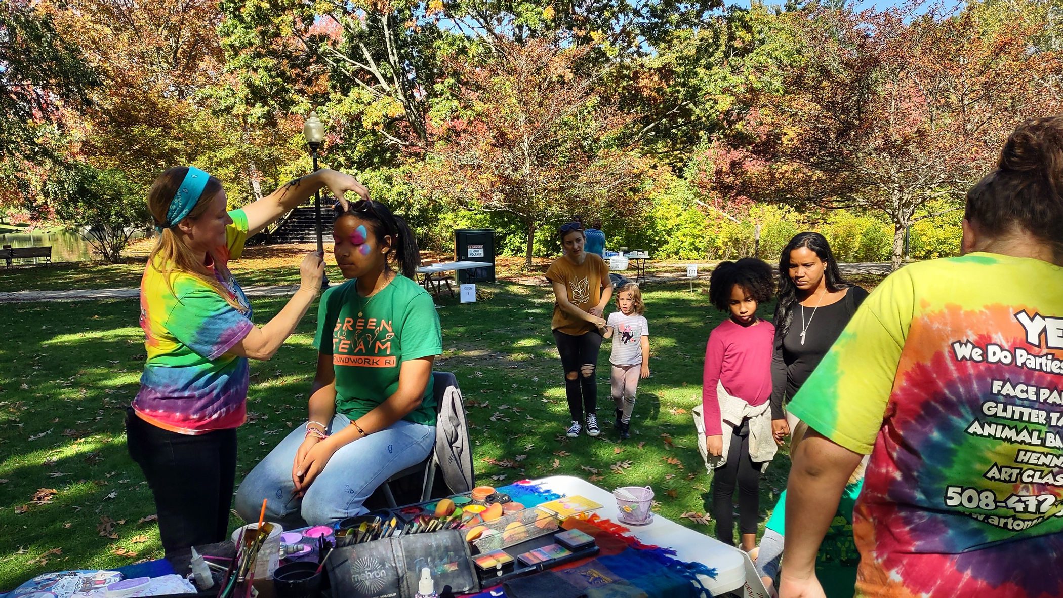 Face painting event in a park with autumn trees. A woman paints a child's face while others wait, surrounded by art supplies.
