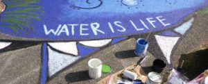 A colorful sidewalk mural reads "WATER IS LIFE" with paint cans and brushes scattered around.
