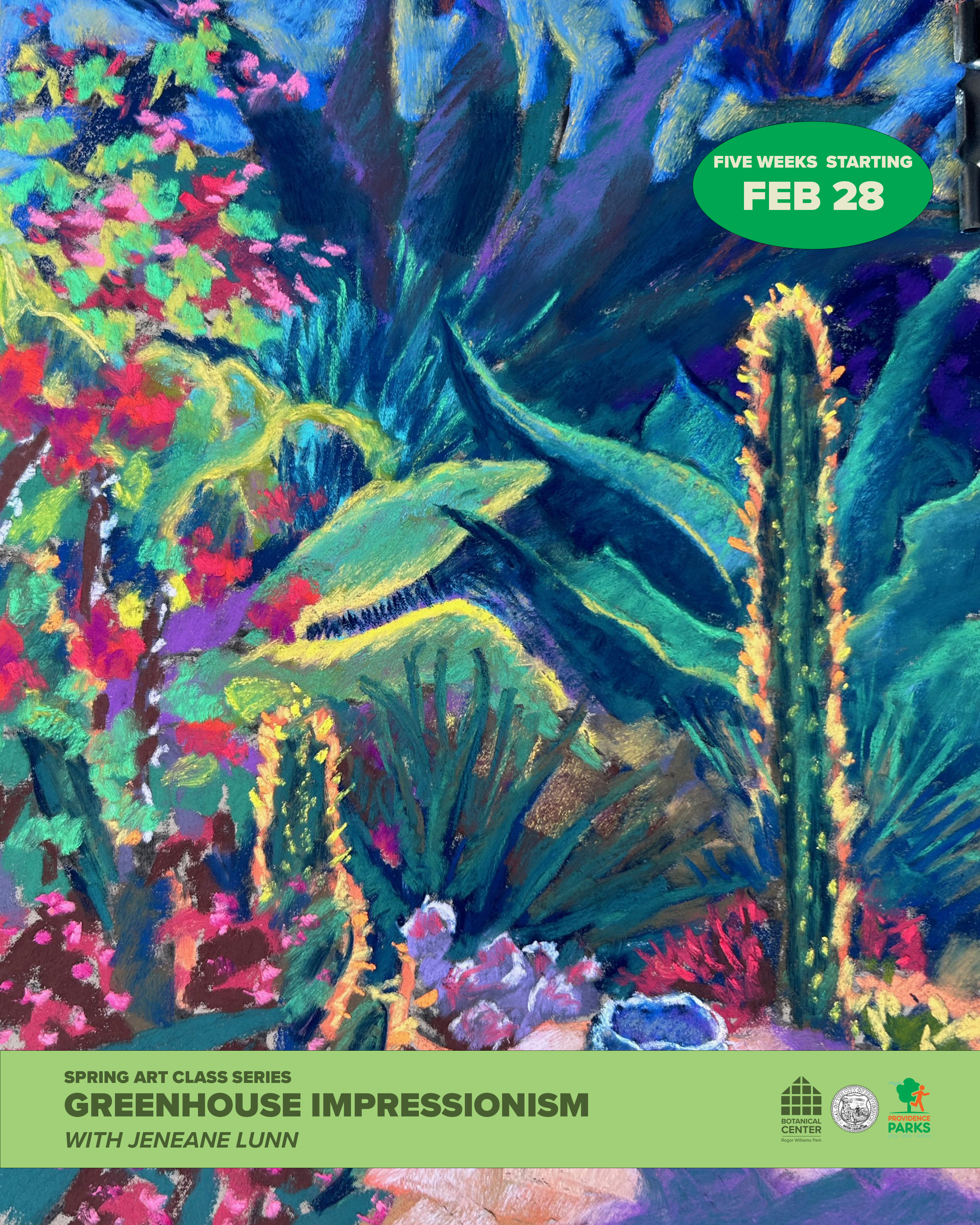 Using the techniques of the Impressionist painters, students will work to capture the changing light effects of nature in the tropical environment of the Roger Williams Park Botanical Center greenhouses, or weather permitting, in the outdoor Winter Garden. Soft pastels are a great medium for doing small studies or finished work. This class will offer an easy technique for starting pastels that you can develop into your own finished pieces of art. Our focus will be on increasing our perception of color to create more and more complex, beautiful layers of color while enjoying the serenity of the garden.