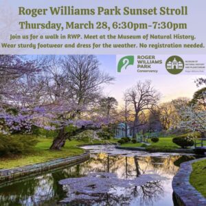 Join in a community walk to appreciate the sunsets as seen from the beauty in Providence’s beautiful back yard “Roger Williams Park”. Wear Sturdy Footwear and dress for the weather. No registration necessary.