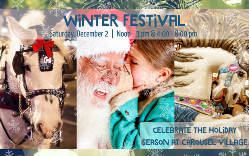 During the evening, 4:00 – 8:00 pm, join with friends and family take a horse drawn hayride through the park, visit Santa, see a dazzling holiday light display, enjoy a variety of food carts, sip some hot cocoa and get into the festive mood on the historic Carousel! All ages welcome.