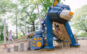 The Bear can be climbed on all exterior sides while nooks create secret hiding spaces or a place of quiet respite. Shaded under a canopy of mature trees, Bear playground also includes a picnic area.