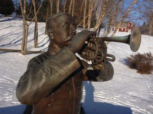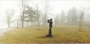 This monument was originally on the “island” in Roosevelt Lake, creating the appearance of playing in front of the Bandstand. The statue was placed in storage for many years, but the original location is still there. Can you find the original pedestal on the former island, on the bank of Roosevelt Lake?