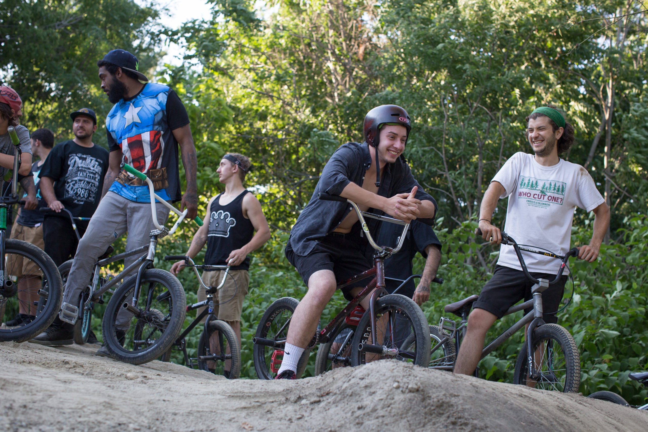 A group of BMX riders gather outdoors. One wears a Captain America shirt, another a helmet. They chat and smile, surrounded by greenery.