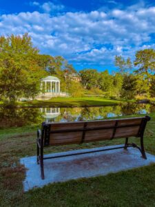 A wooden bench overlooks a pond with a reflection of a white rotunda and surrounding trees under a blue sky with clouds.