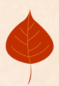 A stylized illustration of an orange leaf with yellow veins on a light beige background.