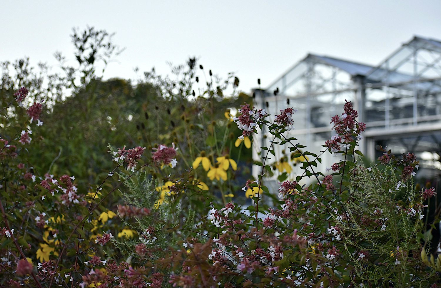 Floral foreground with pink and yellow blossoms, set against the backdrop of a glass greenhouse structure.
