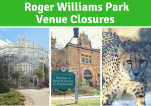 Roger Williams Park Venue Closures: images of a greenhouse, the Museum of Natural History & Planetarium, and a cheetah.