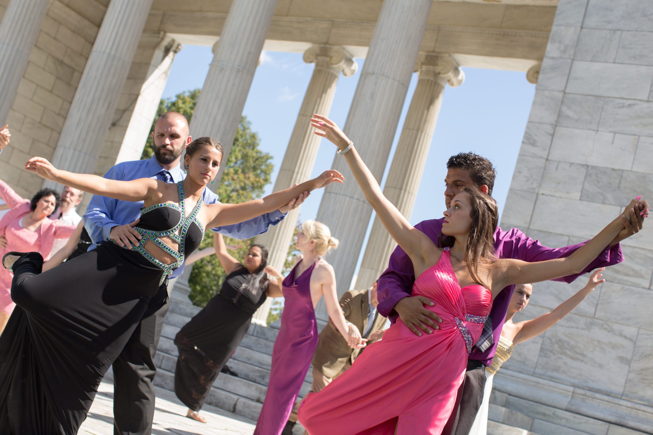 Couples in elegant attire dance gracefully in front of a neoclassical building with columns on a sunny day.