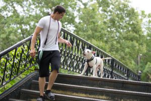 A man in a white shirt and black shorts walks down metal stairs with a white dog wearing a harness, surrounded by greenery.