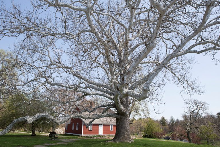 A large, leafless tree with sprawling branches stands in front of a red house with a stone foundation on a grassy lawn.