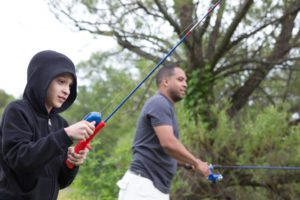 A boy in a black hoodie and a man in a gray shirt fish together, surrounded by greenery and trees.