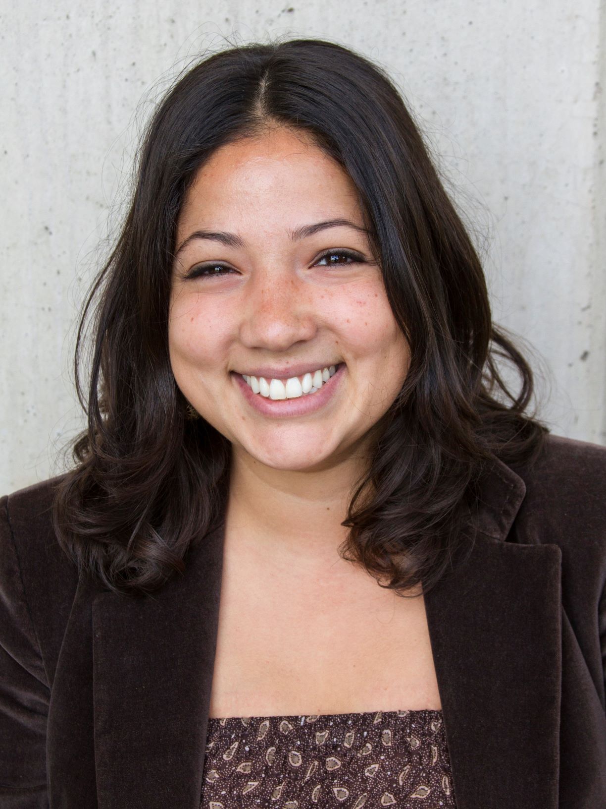 Smiling woman with shoulder-length dark hair wearing a brown blazer and patterned top, standing in front of a light-colored concrete wall.